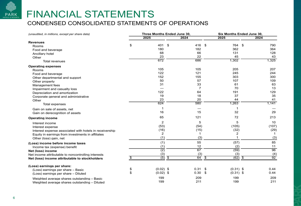 Park Hotels reported total revenues of $672 million for Q2 2025, representing a slight decline from $686 million in the same period last year. The company posted a net loss attributable to stockholders of $5 million, a significant drop from the $64 million net income reported in Q2 2024.