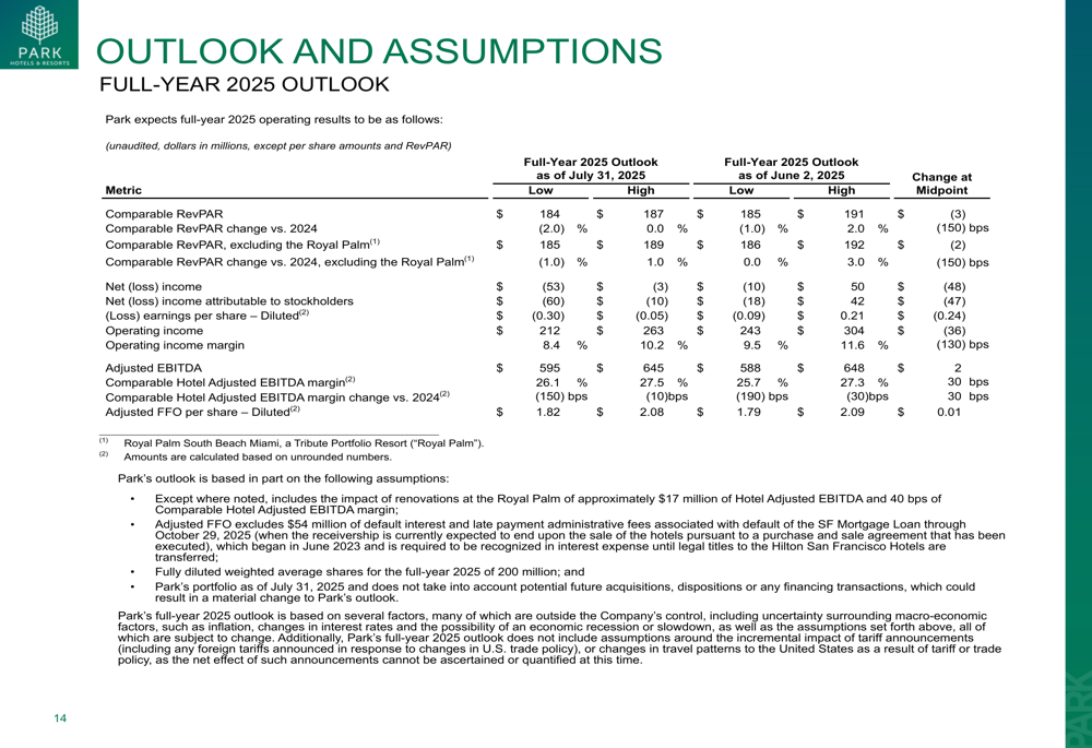 Park Hotels revised its full-year 2025 outlook downward compared to previous guidance provided on June 2, 2025. The updated outlook, as of July 31, 2025, projects: