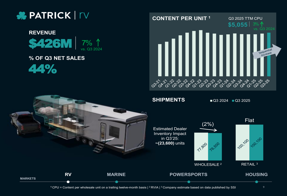 The RV segment, which accounts for 44% of net sales, grew 7% year-over-year to $426 million, outperforming a 2% decrease in wholesale industry unit shipments. Content per unit increased 3% to $5,055, demonstrating Patrick's ability to expand its product offerings within each RV.