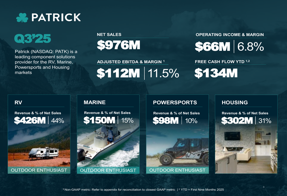 Patrick Industries continues to position itself as a leading component solutions provider for the outdoor enthusiast lifestyle markets, leveraging its entrepreneurial spirit, innovation capabilities, and full-solutions model to enhance customer experience while maintaining a strong financial foundation for future growth.