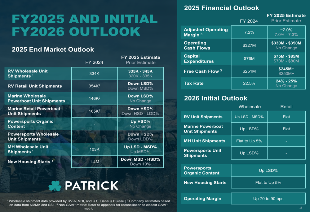 For FY 2026, Patrick anticipates improvements in operating margins and growth in RV, marine, and powersports shipments. According to CEO Andy Nemeth in the earnings call, the company sees potential for inventory restocking, which could drive future sales growth.