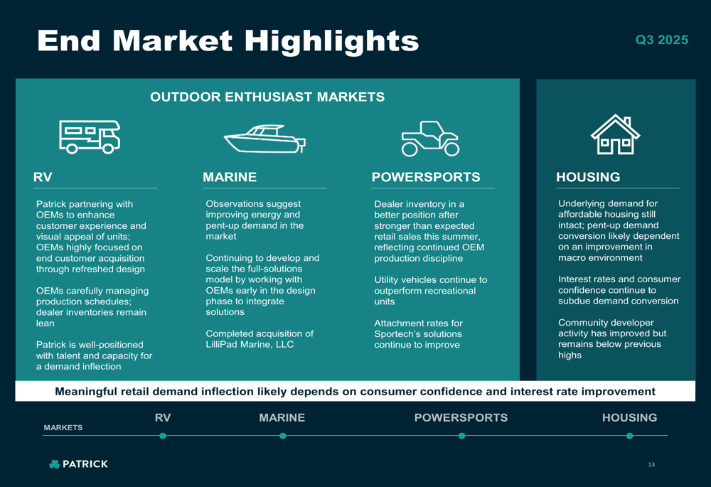Patrick provided qualitative insights across its end markets, noting improving design appeal in RVs, growing energy and pent-up demand in marine, better positioned inventory in powersports, and underlying demand in housing: