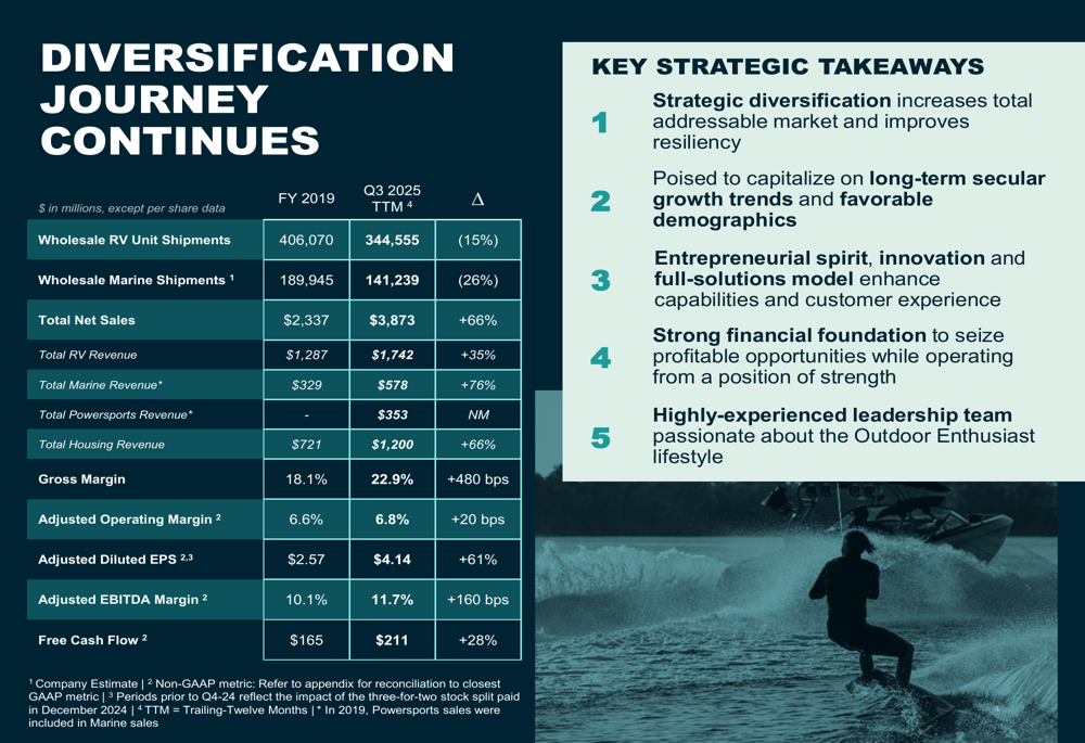 Despite a 15% decline in wholesale RV unit shipments and a 26% drop in wholesale marine shipments compared to 2019, Patrick has grown its total net sales by 66% to $3.87 billion (trailing twelve months). This growth has been accompanied by significant margin improvements, with gross margin expanding 480 basis points to 22.9% and adjusted EBITDA margin increasing 160 basis points to 11.7%.