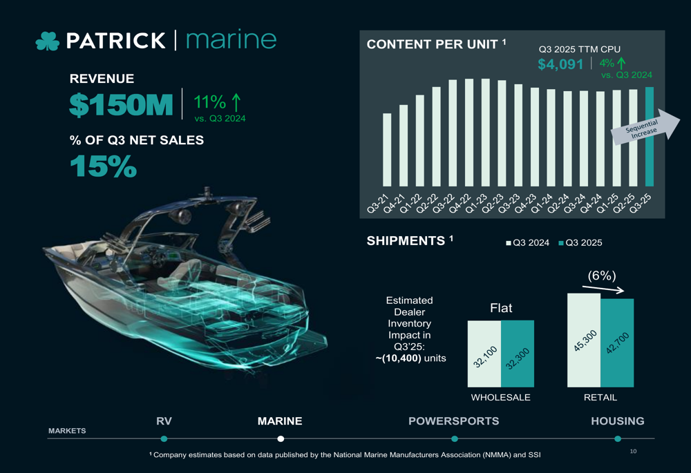 The marine segment showed robust 11% growth to $150 million (15% of total sales), outperforming flat wholesale powerboat industry unit shipments. Content per unit increased 4% to $4,091, reflecting successful product penetration strategies.