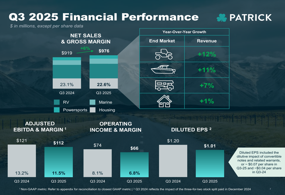 Despite outperforming industry wholesale shipments across key segments, Patrick experienced some margin pressure, with operating margin decreasing from 8.1% in Q3 2024 to 6.8% in Q3 2025. This quarterly financial performance is illustrated in the following chart:
