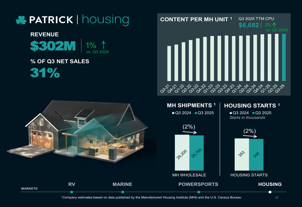 During Q3 2025, Patrick continued its strategic growth through the acquisition of LilliPad Marine, LLC, further strengthening its marine segment capabilities. The company also invested in infrastructure modernization to enhance operational efficiency.