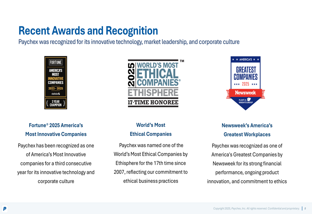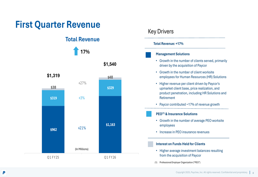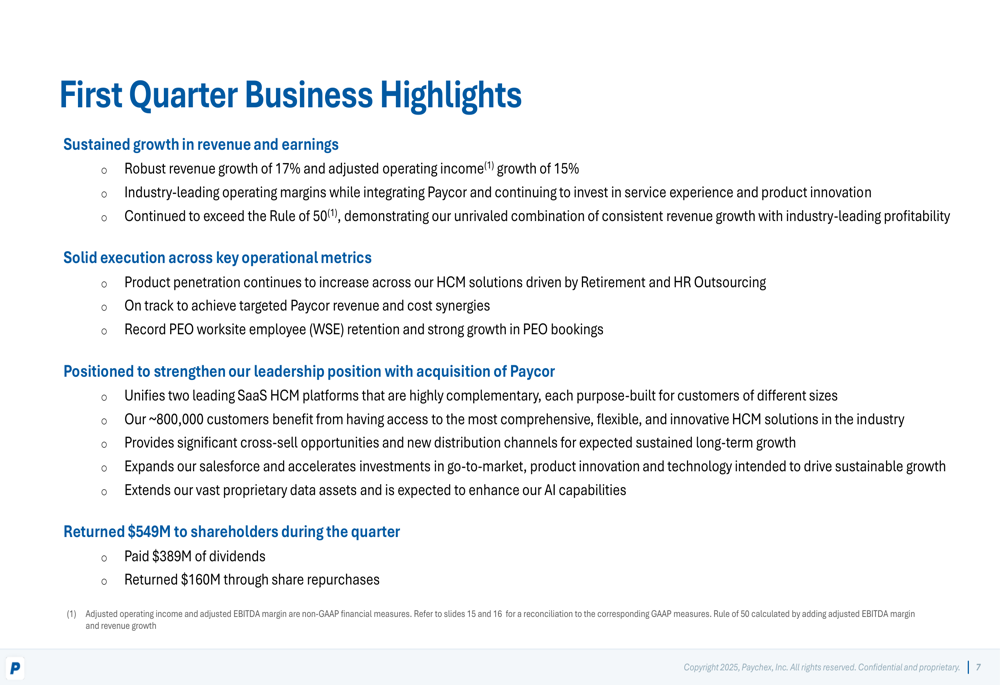 Paychex highlighted several business achievements during the first quarter, emphasizing the strategic benefits of the Paycor acquisition and operational execution across key metrics: