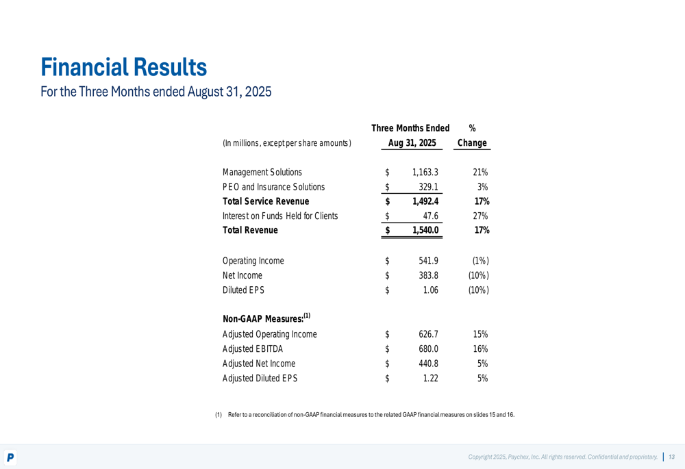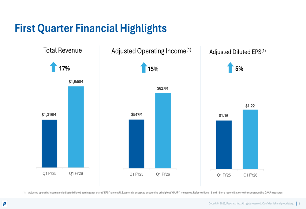 Paychex reported substantial year-over-year growth in its first quarter, with total revenue increasing by 17% to $1.54 billion compared to $1.32 billion in the same period last year. Adjusted operating income grew by 15% to $627 million, while adjusted diluted earnings per share rose 5% to $1.22.