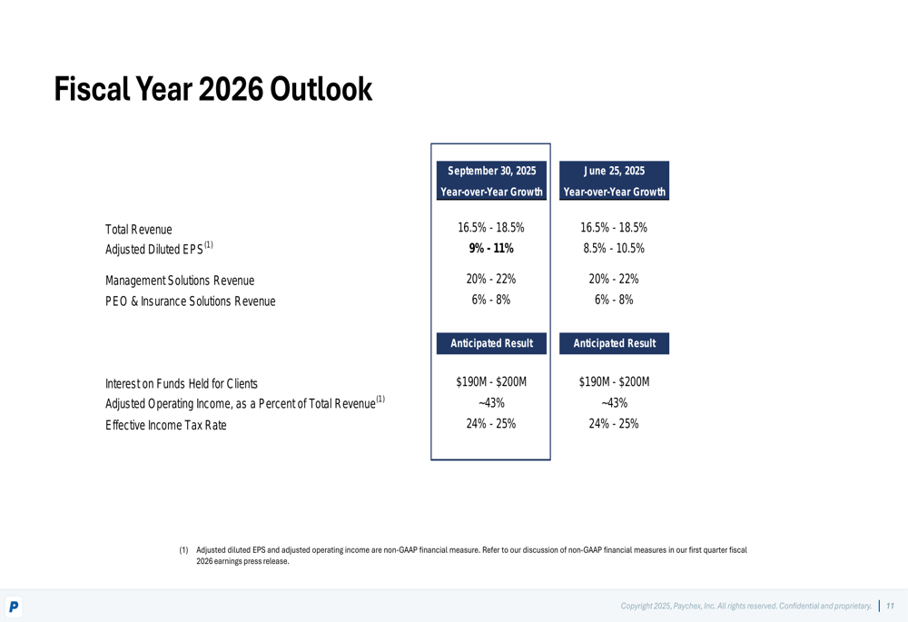 For fiscal year 2026, Paychex maintained its revenue growth outlook of 16.5-18.5% but slightly increased its adjusted diluted EPS growth projection to 9-11%, up from the previous guidance of 8.5-10.5% provided in June: