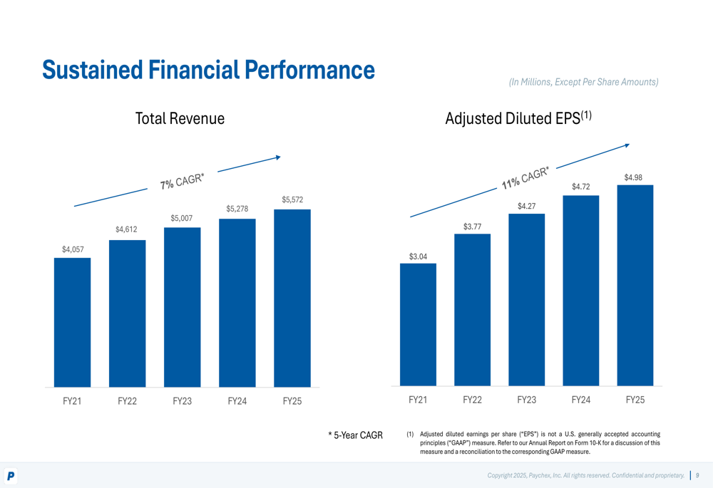 Looking at historical performance, Paychex has demonstrated consistent growth over the past five years, with total revenue increasing at a 7% CAGR from fiscal 2021 to fiscal 2025, while adjusted diluted EPS grew at an 11% CAGR during the same period: