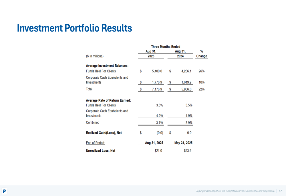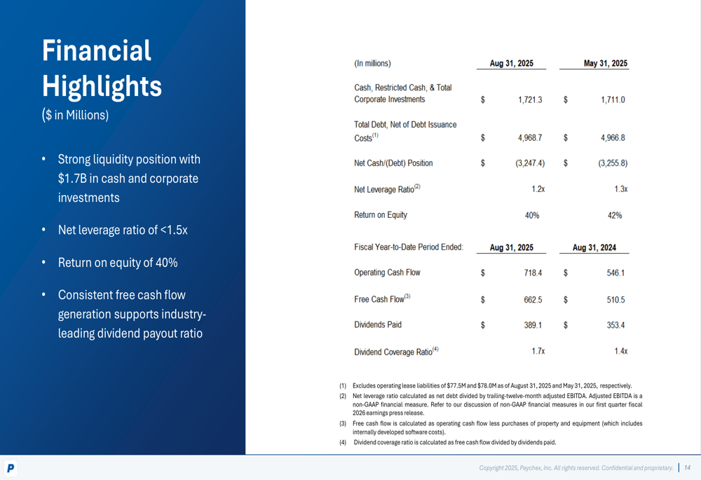 Paychex maintained a strong financial position with $1.72 billion in cash, restricted cash, and total corporate investments as of August 31, 2025, slightly up from $1.71 billion at the end of the previous fiscal year. The company’s net debt position improved marginally to $3.25 billion from $3.26 billion, with a net leverage ratio of 1.2x, down from 1.3x.