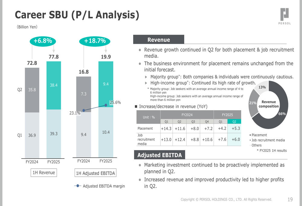 The Career SBU continued its strong performance with revenue growing 6.8% to 77.8 billion yen and adjusted EBITDA increasing 18.7% to 19.9 billion yen. This segment maintained the highest profit margin among all SBUs at 25.6%, driven by revenue growth and productivity improvements: