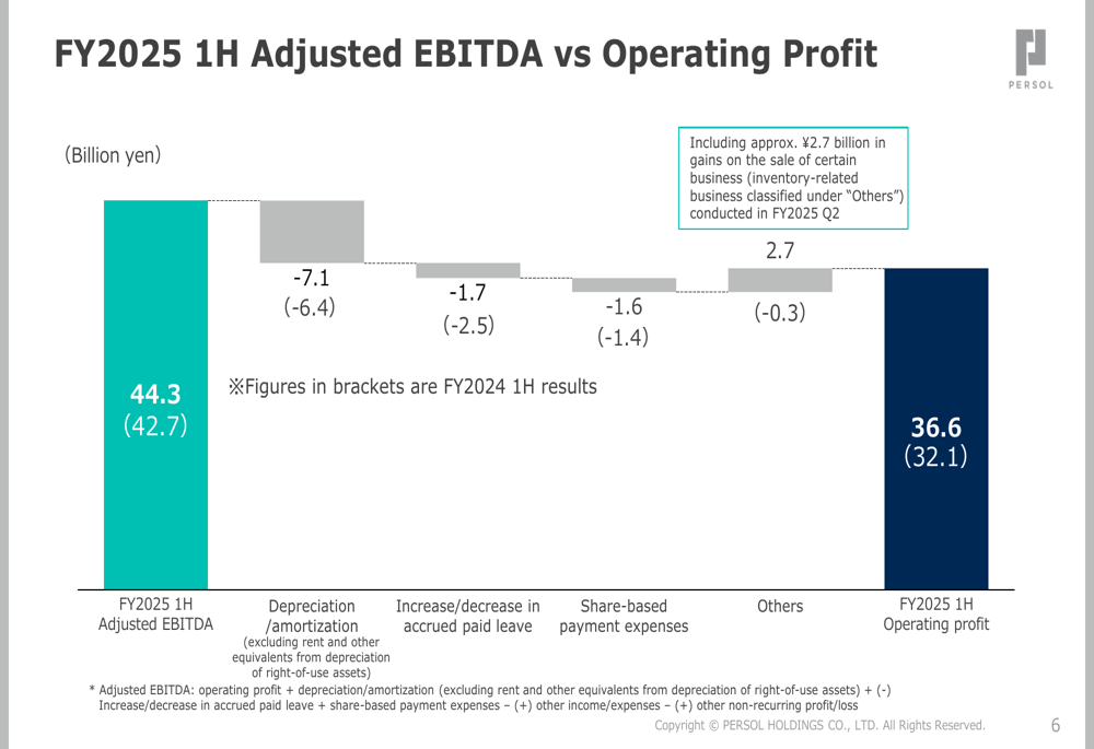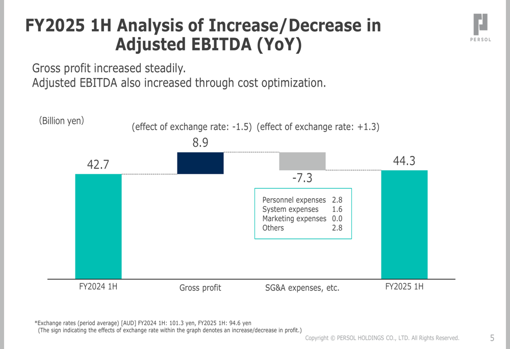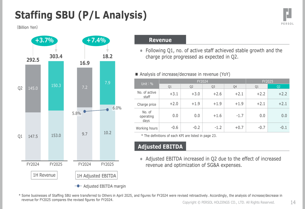 The second quarter of FY2025 saw Persol achieve revenue of 379.0 billion yen, contributing to the strong first-half performance. The company recognized approximately 2.7 billion yen in gains from the sale of a certain business in Q2, which was included in operating profit but excluded from adjusted EBITDA calculations.