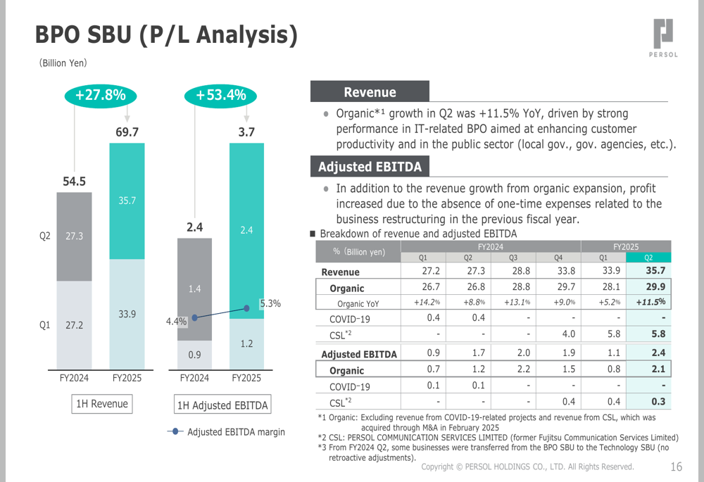 The BPO (Business Process Outsourcing) SBU showed remarkable growth with revenue increasing 27.8% year-over-year to 69.7 billion yen. This growth was partly organic (+8.3%) and partly due to the February 2025 acquisition of PERSOL COMMUNICATION SERVICES LIMITED (formerly Fujitsu Communication Services Limited), which contributed 11.6 billion yen to revenue: