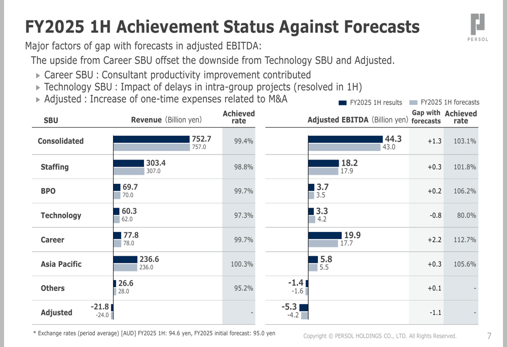 Performance varied across Persol’s Strategic Business Units (SBUs), with the Career SBU being a standout performer. The segment exceeded forecasts with an adjusted EBITDA achievement rate of 112.7%, driven by consultant productivity improvements. Meanwhile, the Technology SBU faced challenges with an 80.0% achievement rate against forecasts due to delays in intra-group projects, though these issues were resolved within the first half.