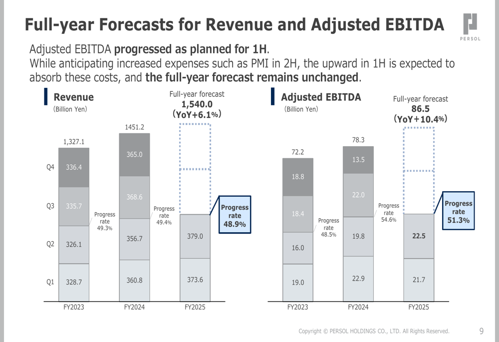Looking ahead, Persol Holdings maintains its full-year forecasts with revenue expected to reach 1,540 billion yen (+6.1% YoY) and adjusted EBITDA projected at 86.5 billion yen (+10.4% YoY). While the company anticipates increased expenses related to PMI activities in the second half, management expects the strong first-half performance to absorb these costs.