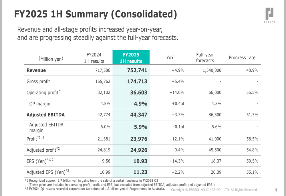 Persol Holdings reported record highs in both revenue and profits for the first half of FY2025, with consolidated revenue reaching 752.7 billion yen, a 4.9% increase year-over-year. The company’s operating profit grew by 14.0% to 36.6 billion yen, while adjusted EBITDA rose 3.7% to 44.3 billion yen. These results position the company well to achieve its full-year targets despite anticipated temporary expenses related to post-merger integration (PMI) in the second half of the fiscal year.
