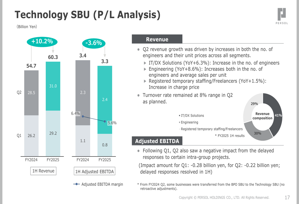 The Technology SBU, despite facing temporary challenges, achieved 10.2% revenue growth to 60.3 billion yen, though adjusted EBITDA declined by 3.6%. The segment was impacted by delays in certain intra-group projects, which reduced profit by approximately 0.5 billion yen in the first half: