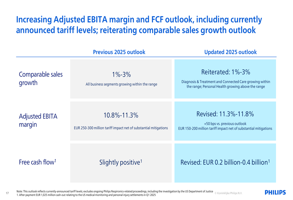Philips has maintained its 2025 comparable sales growth outlook at 1-3%, but has increased its adjusted EBITA margin guidance by 50 basis points to 11.3-11.8%. The company also raised its free cash flow outlook from "slightly positive" to €0.2-0.4 billion, reflecting improved operational performance and working capital management.