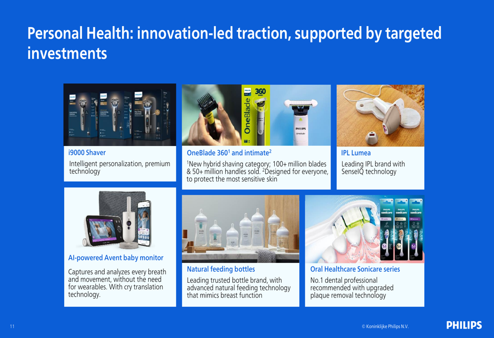 The segment’s growth was driven by innovation across multiple product lines, including the i9000 Shaver, OneBlade 360, IPL Lumea, AI-powered Avent baby monitors, and Sonicare oral healthcare products. The company noted strong underlying growth across most geographies for these consumer-focused products: