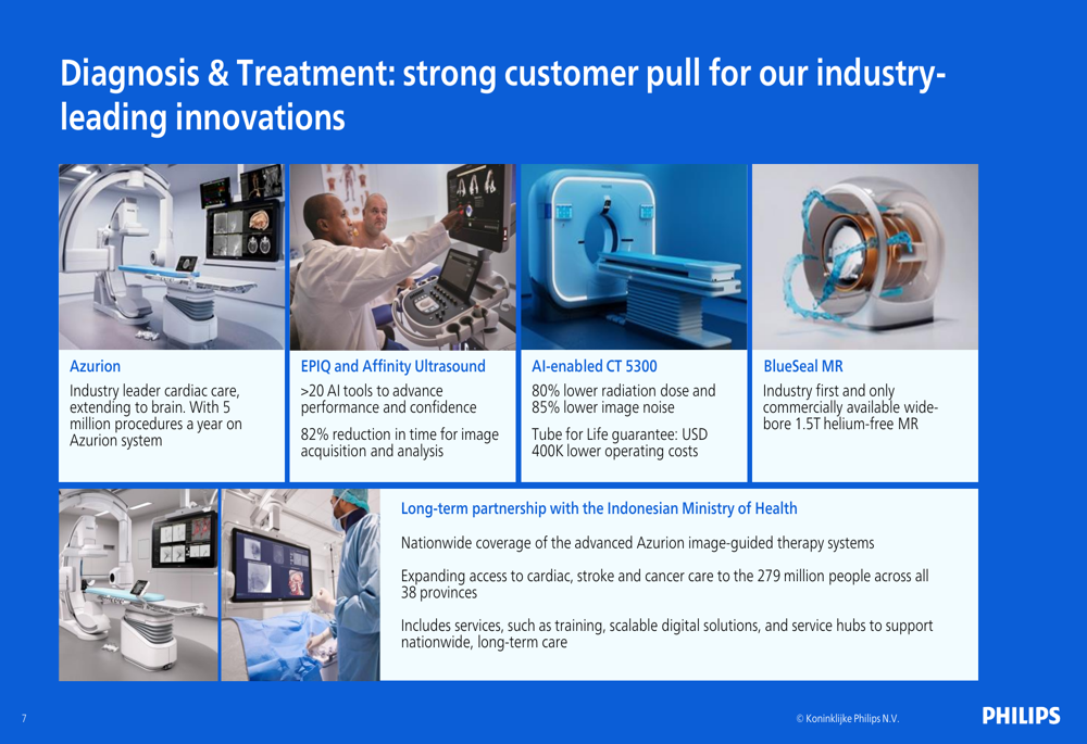 The segment continues to focus on innovation, showcasing leading products including the Azurion platform for cardiac care, EPIQ and Affinity Ultrasound systems with over 20 AI tools, and the helium-free BlueSeal MR technology. These innovations are illustrated in the company’s presentation:
