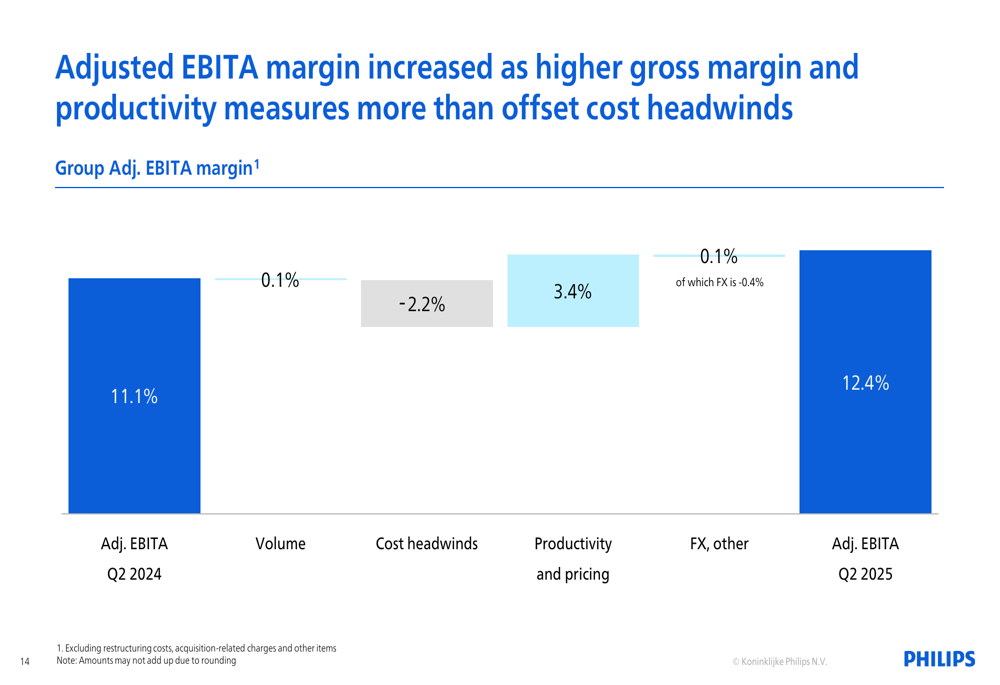 Philips reported sales of €4,338 million in Q2 2025, representing 1% comparable growth year-on-year. The company’s adjusted EBITA reached €540 million with a margin of 12.4%, improving 130 basis points compared to Q2 2024. Free cash flow was €230 million, representing a substantial year-on-year improvement of €294 million.