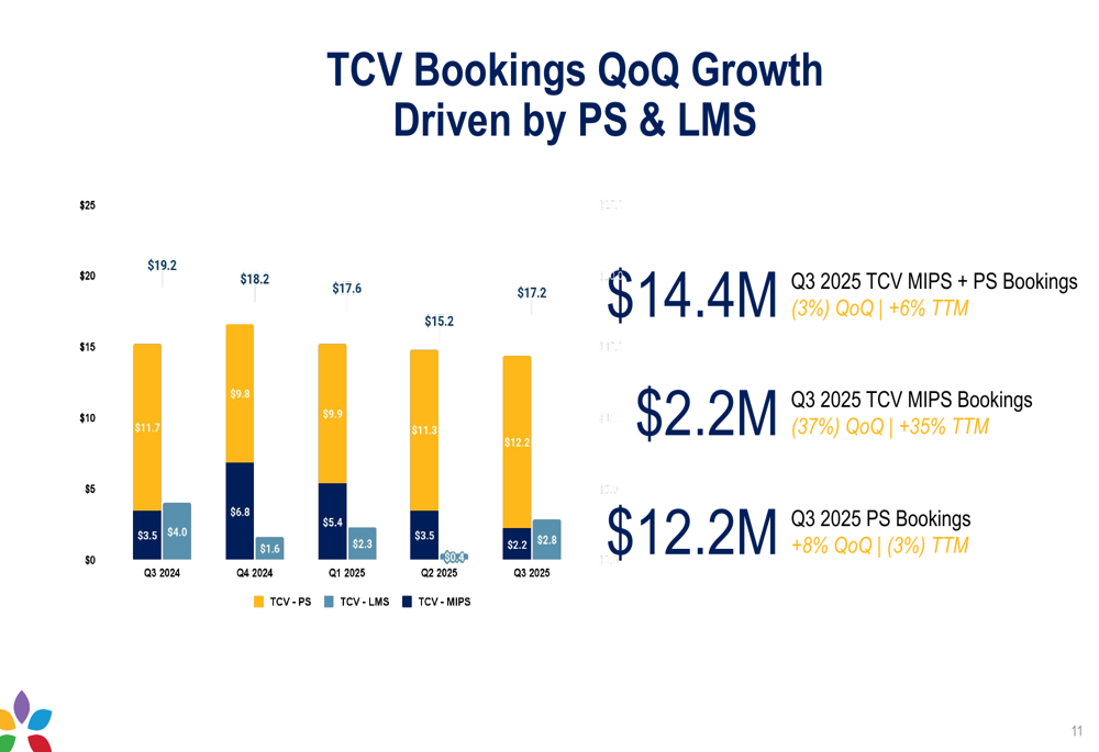 The company reported Q3 2025 MIPS + Professional Services (PS) Total Contract Value (TCV) Bookings of $14.4 million, representing a 6% increase on a trailing twelve-month basis, though down 3% quarter-over-quarter. Professional Services bookings showed particular strength, growing 8% quarter-over-quarter to $12.2 million.