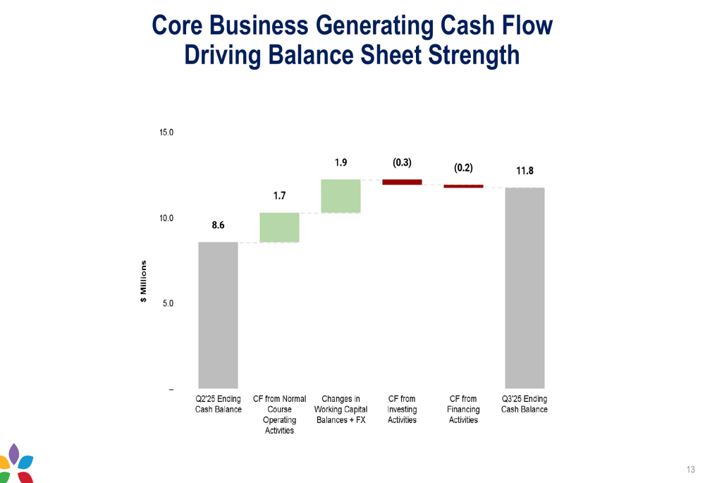 Pivotree’s financial position strengthened during Q3 2025, with cash balances increasing from $8.6 million at the end of Q2 to $11.8 million by quarter-end. This $3.2 million improvement was driven by $1.7 million in cash flow from normal course operating activities and $1.9 million from working capital improvements and foreign exchange effects.