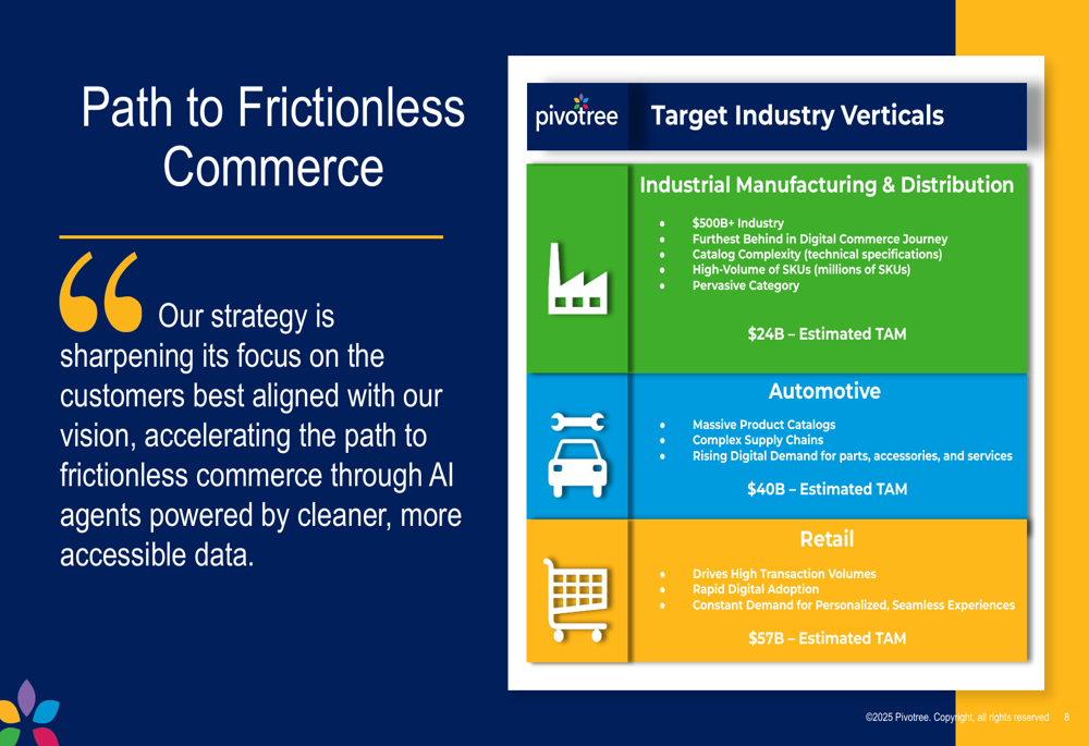 Pivotree has identified three target industry verticals with specific characteristics that align with its solutions. The company is focusing on industries with complex product catalogs, high transaction volumes, and digital transformation needs: