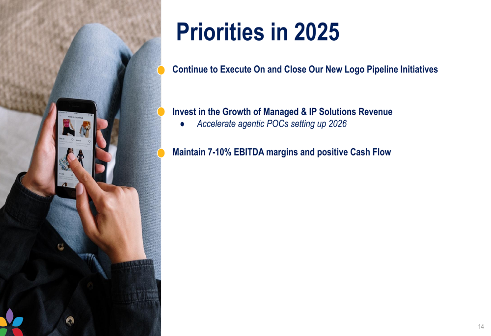 The company aims to maintain 7-10% EBITDA margins and positive cash flow while investing in growth initiatives. Management expects to continue executing on its new logo pipeline and accelerating proof-of-concepts for AI-driven "agentic" solutions to set the stage for 2026 growth.