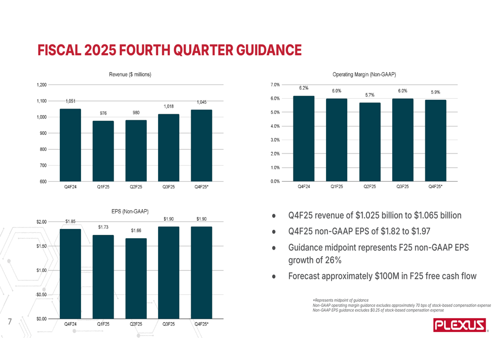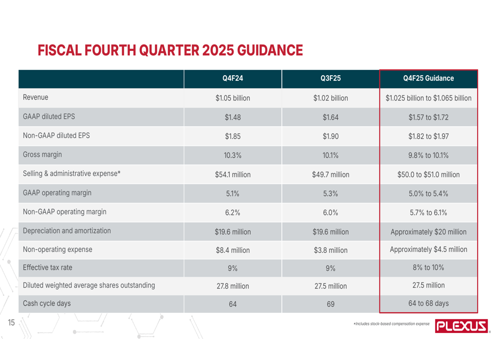 Looking ahead to the fourth quarter of fiscal 2025, Plexus provided guidance for revenue between $1.025 billion and $1.065 billion, with non-GAAP EPS expected to range from $1.82 to $1.97. The company anticipates maintaining strong operating margins, with non-GAAP operating margin guidance of 5.7% to 6.1%.