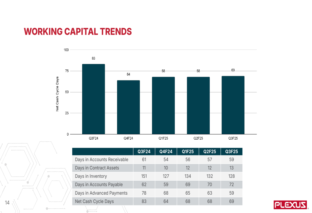 Working capital management remained a focus area, with cash cycle days at 69 days in Q3F25, slightly higher than the 68 days reported in Q2F25 but significantly improved from 83 days in Q3F24. Inventory days continued to decrease, reaching 128 days compared to 151 days a year ago, demonstrating the company’s commitment to operational efficiency.