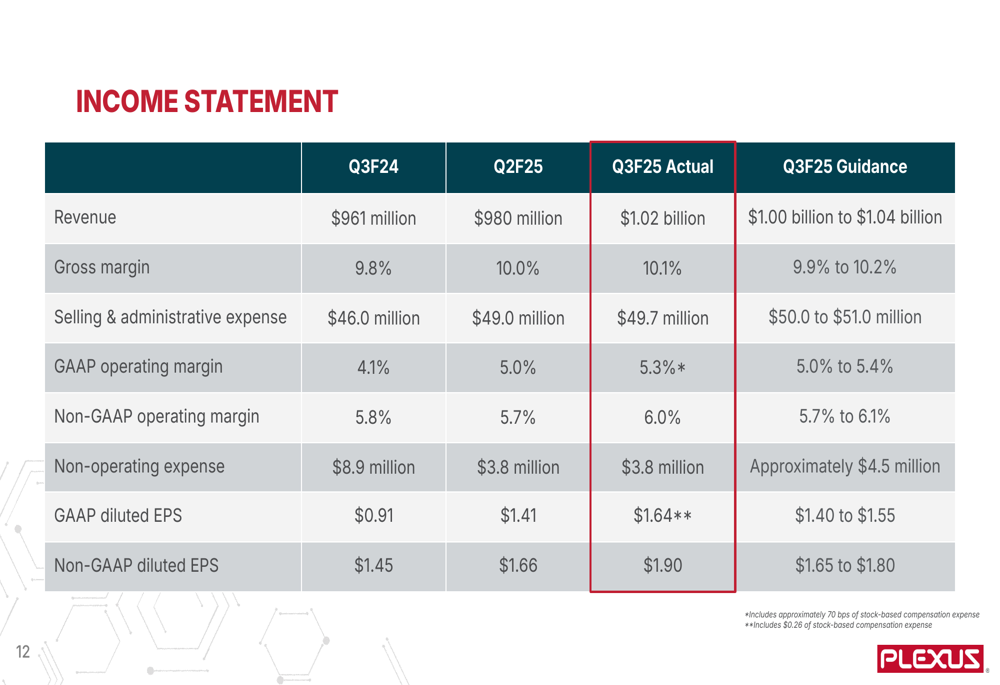 Plexus reported Q3 fiscal 2025 revenue of $1.051 billion, representing sequential growth from $1.018 billion in Q2. The company achieved a non-GAAP operating margin of 6.0%, meeting its stated goal, and delivered non-GAAP EPS of $1.90, which exceeded guidance. These results demonstrate the company’s continued financial strength and operational efficiency.