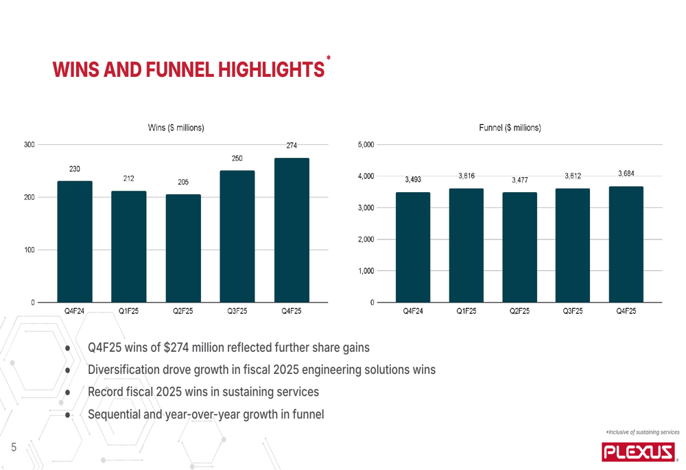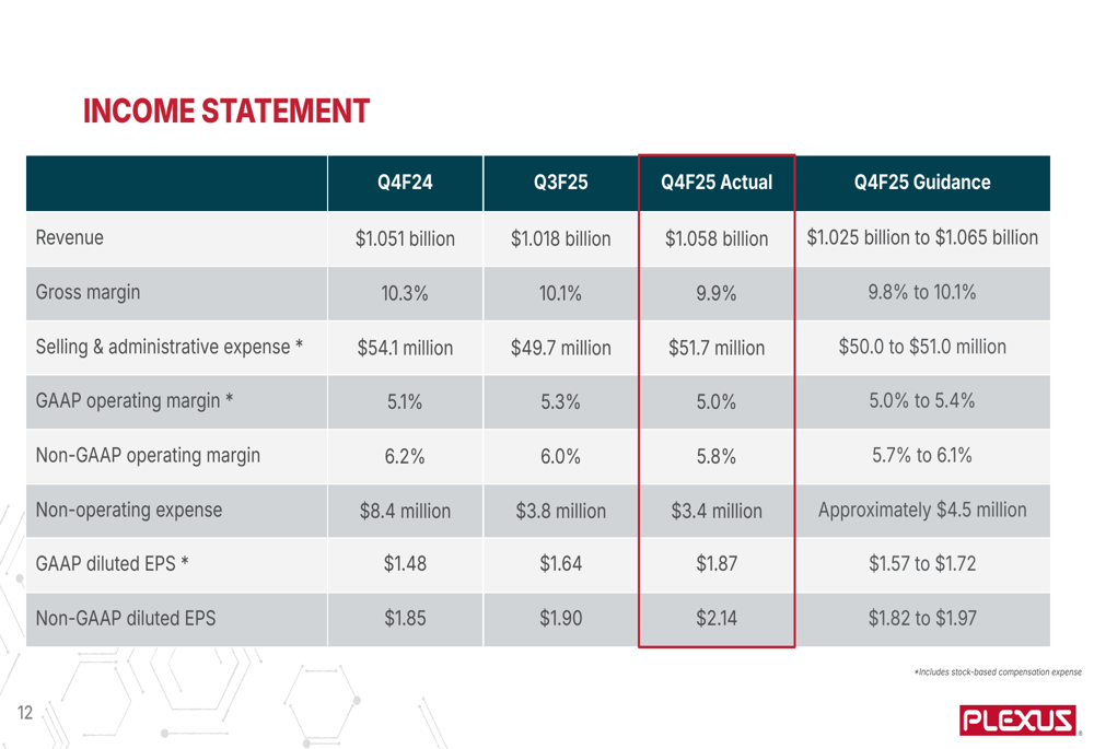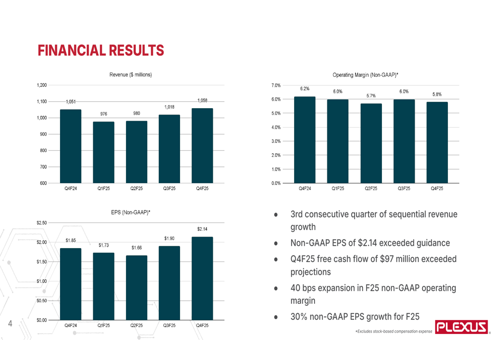 Plexus reported its third consecutive quarter of sequential revenue growth in Q4 2025, with revenue reaching $1.058 billion. The company’s non-GAAP operating margin came in at 5.8%, while non-GAAP EPS of $2.14 significantly exceeded guidance. For the full fiscal year 2025, Plexus achieved 30% non-GAAP EPS growth and a 40 basis point expansion in non-GAAP operating margin.