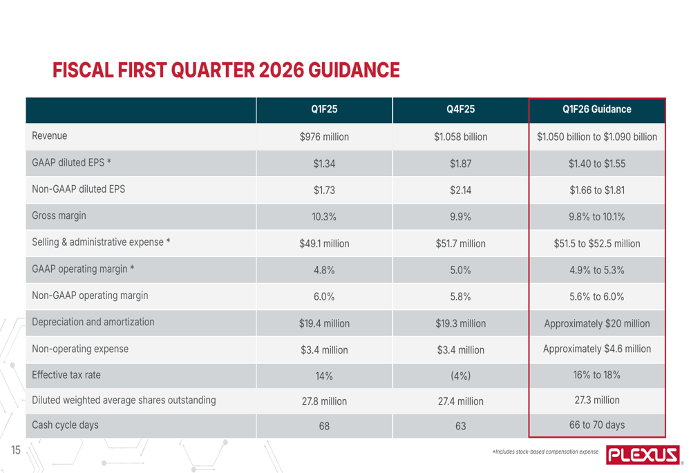 Looking ahead to fiscal 2026, Plexus provided Q1 guidance with revenue expected between $1.050 billion and $1.090 billion, representing modest sequential growth. The company projects non-GAAP EPS between $1.66 and $1.81 for Q1 2026, with a non-GAAP operating margin between 5.6% and 6.0%.