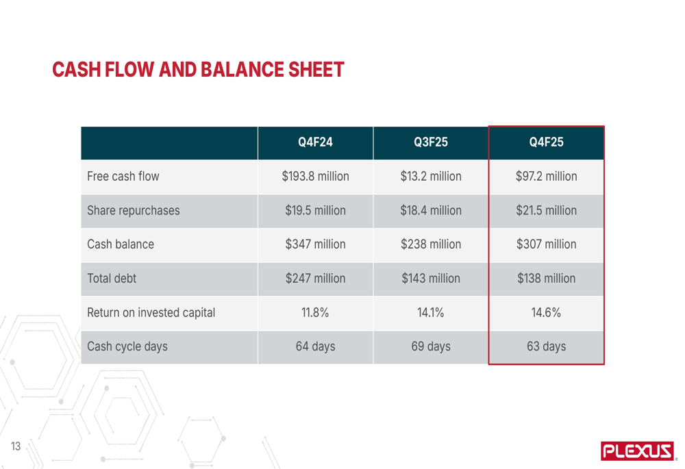Plexus demonstrated strong financial health in Q4 2025, generating $97.2 million in free cash flow, significantly exceeding projections. The company’s cash balance improved to $307 million, while total debt decreased to $138 million. Return on invested capital reached 14.6%, up from 14.1% in the previous quarter.