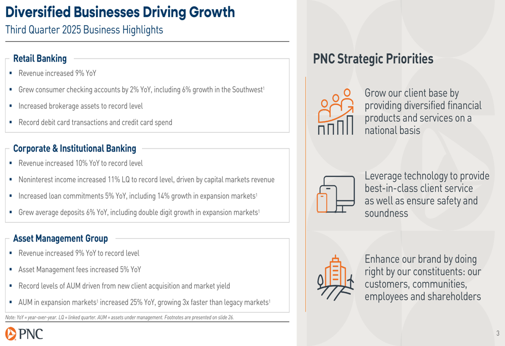 The bank’s efficiency ratio improved to 58.5% in Q3 2025, compared to 61.2% in the same quarter last year, reflecting PNC’s ability to generate revenue while controlling costs. Pretax, pre-provision earnings increased by 8% quarter-over-quarter and 17% year-over-year to $2.45 billion.