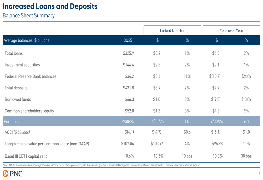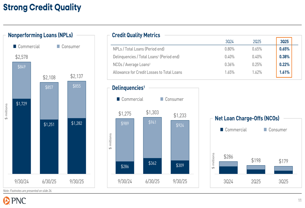 Credit quality remained strong, with nonperforming loans decreasing to 0.65% of total loans from 0.80% a year ago. Net charge-offs declined to 0.22% of average loans, down from 0.36% in Q3 2024 and 0.25% in Q2 2025. This improvement in credit metrics reflects PNC’s disciplined risk management approach and the overall health of its loan portfolio.