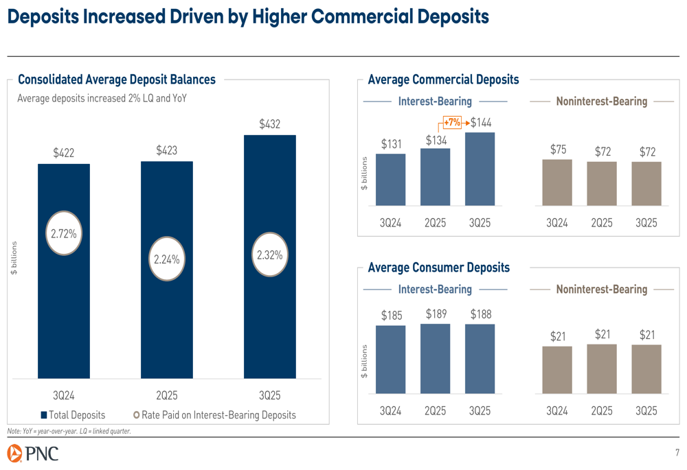 Deposit growth was primarily driven by higher commercial deposits, which increased to $216 billion in Q3 2025, up from $206 billion in Q3 2024. Interest-bearing commercial deposits showed particularly strong growth, increasing from $131 billion to $144 billion year-over-year. Consumer deposits remained relatively stable at $209 billion.