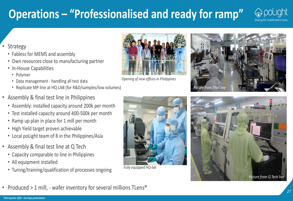 poLight has made significant investments in its operational capabilities to prepare for future growth. The company has established assembly and final test lines in the Philippines and at Q Tech, with installed capacity of around 200,000 units per month for assembly and 400,000-500,000 units per month for testing, as detailed in the following slide: