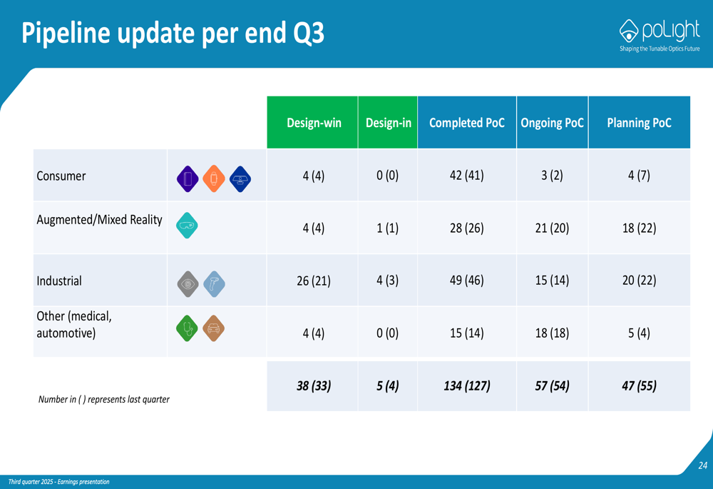 poLight has also made substantial progress in expanding its customer base and securing design wins across multiple sectors. The company now has 38 design wins (up from 33) and 5 design-ins (up from 4), with a pipeline of 134 completed proof of concepts (PoCs), 57 ongoing PoCs, and 47 planning PoCs.