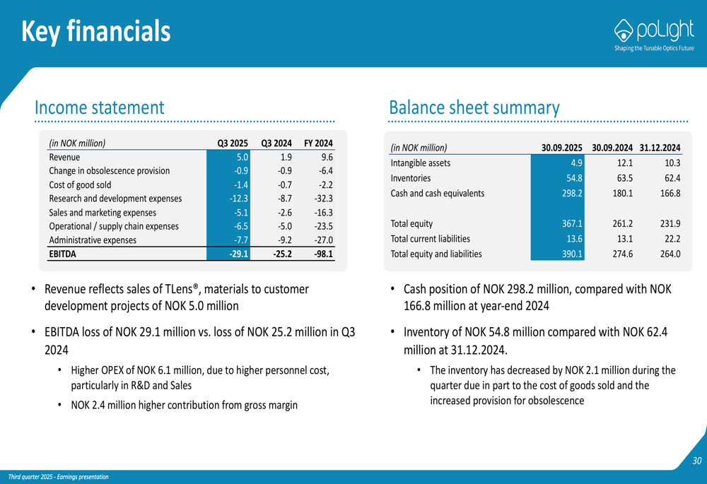 poLight reported Q3 2025 revenue of NOK 5.0 million, a 163% increase compared to NOK 1.9 million in Q3 2024. This growth was primarily driven by sales of TLens® and materials for customer development projects, particularly in the AR/MR segment.