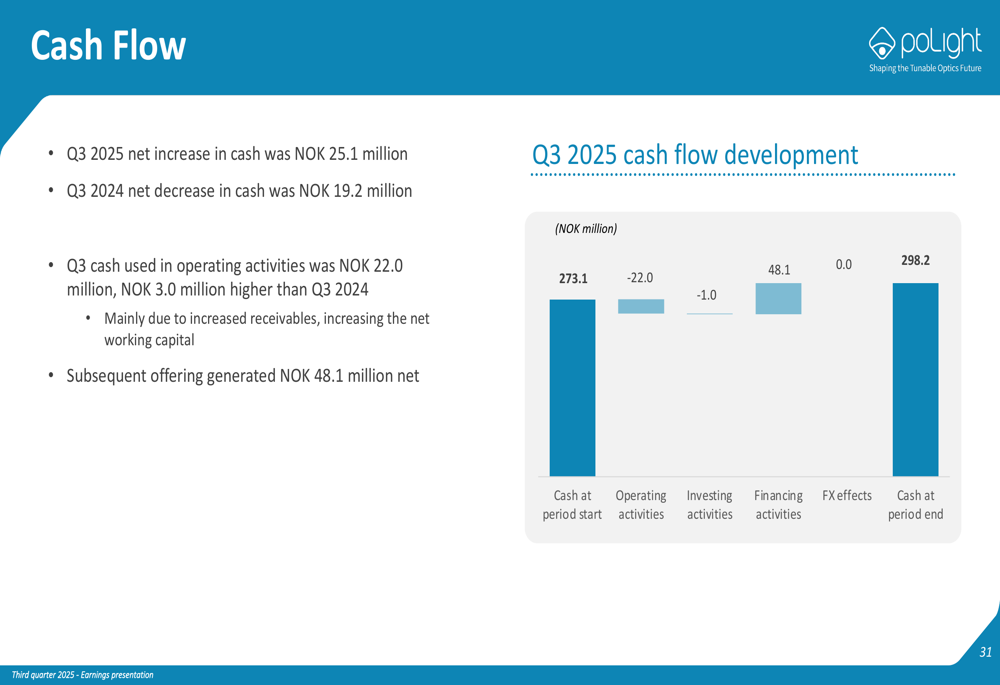 The company’s cash position strengthened significantly to NOK 298.2 million at the end of Q3 2025, compared to NOK 166.8 million at year-end 2024. This improvement was largely due to a subsequent offering that generated NOK 48.1 million net during the quarter, as illustrated in the cash flow summary: