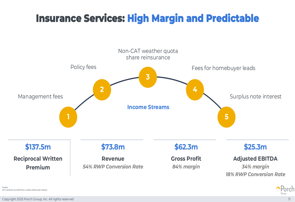 The Insurance Services segment continues to be Porch Group’s primary growth driver, generating $73.8 million in revenue with an impressive gross profit margin of 84% ($62.3 million) and adjusted EBITDA of $25.3 million (34% margin). The segment’s Reciprocal Written Premium (RWP) reached $137.5 million, with a conversion rate of 18% from RWP to Insurance Services Adjusted EBITDA.
