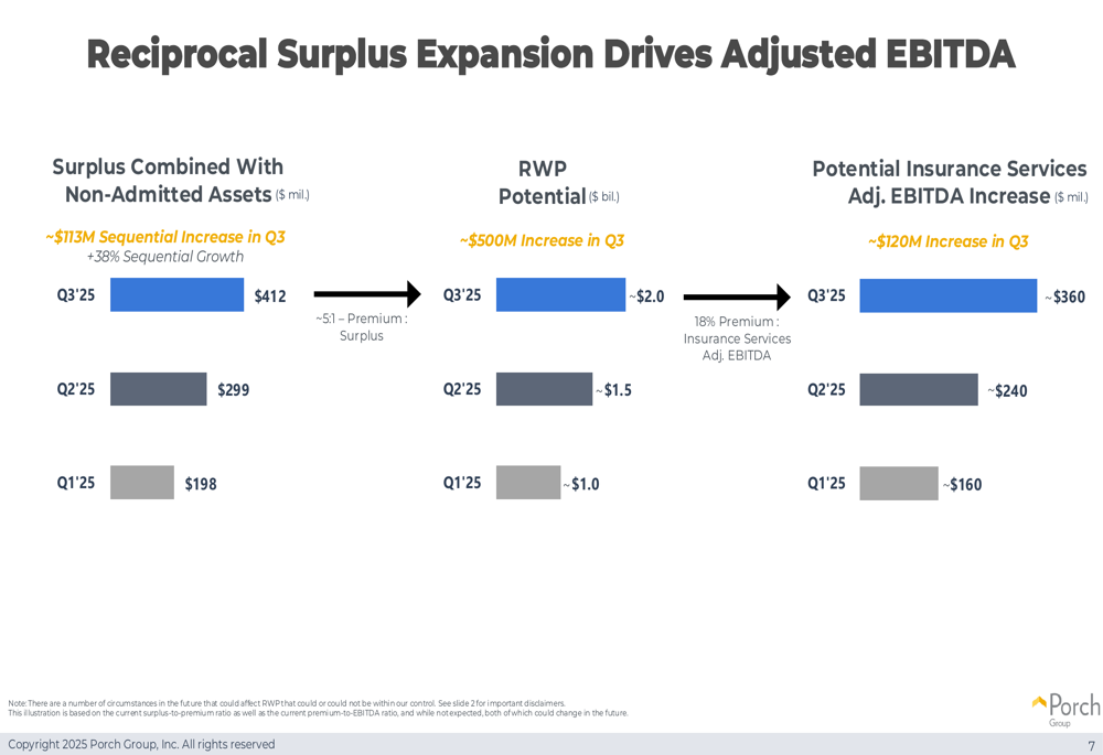 A key strategic focus for Porch Group is the expansion of its reciprocal surplus, which enables future premium growth. The company’s surplus combined with non-admitted assets grew to $412 million in Q3’25, a sequential increase of approximately $113 million from Q2’25.