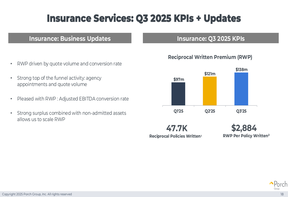 The company reported strong top-of-funnel activity with increasing agency appointments and quote volumes. During the quarter, Porch wrote 47,700 reciprocal policies with an average RWP per policy of $2,884.