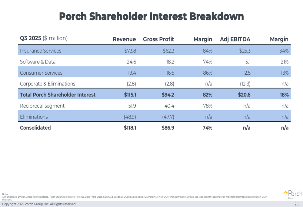 Porch Group’s Q3 2025 results demonstrated significant year-over-year improvements in key financial metrics. The company’s Porch Shareholder Interest revenue reached $115.1 million, with gross profit of $94.2 million representing an 82% margin. This gross profit figure marked a substantial increase of $33 million or 53% compared to the prior year.