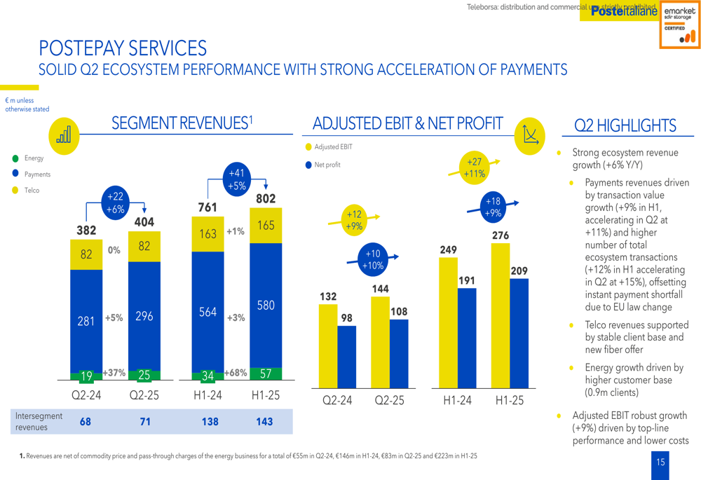 The Postepay Services segment continued its solid performance, with external revenues growing by 5% to €802 million in H1 2025. Adjusted EBIT increased by 11% to €276 million, demonstrating the strength of the company's payments ecosystem.