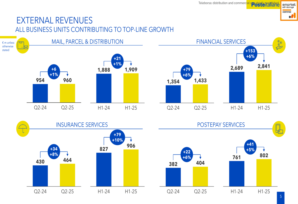The breakdown of external revenues by business unit illustrates the balanced growth across Poste Italiane's operations: