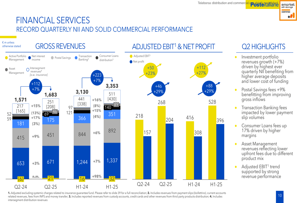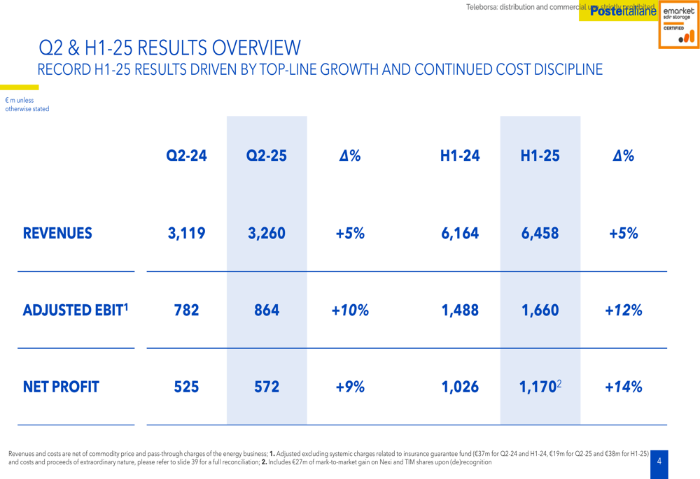 Poste Italiane delivered exceptional financial results for H1 2025, with record revenues of €6,458 million, representing a 5% year-over-year increase. This growth was complemented by a 12% rise in adjusted EBIT to €1,660 million and a 14% increase in net profit to €1,170 million.